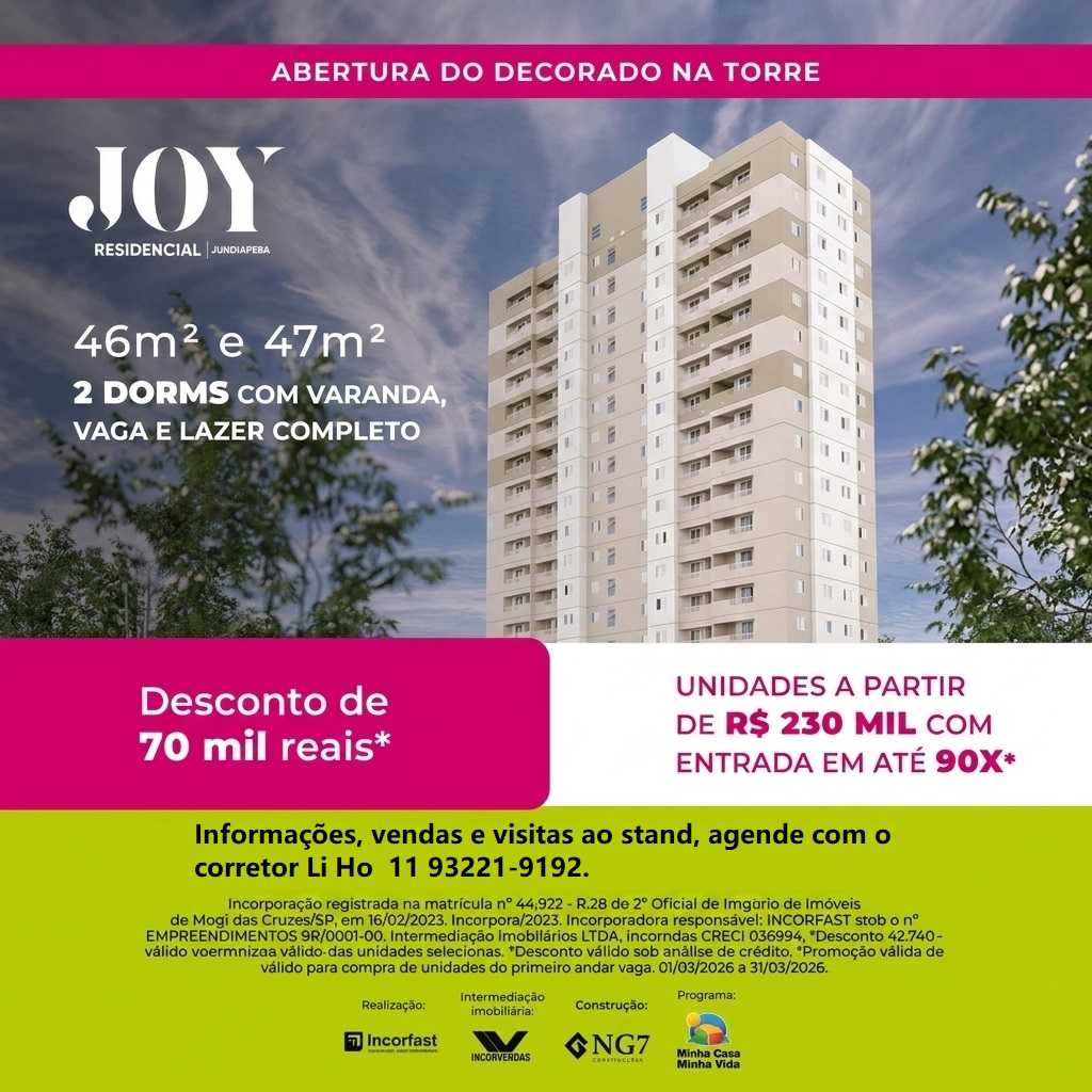 Apartamentos de 46m² e 47m² com sacada, vaga, elevadores e lazer. dentro do programa Minha Casa Minha Vida, cadastre-se com a documentação para análise de crédito sem compromisso, se aprovado, escolhemos a unidade e montamos o fluxo de pagamento da entrada. Previsão de entrega 36 meses após lançamento.